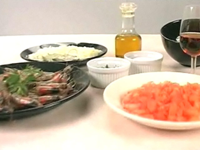 Рецепт креветок по-американски.Состав:креветки — 30 штук;лук — 1-2 штуки;петрушка — 1 пучок;помидоры — 2 штуки;соль, масло, лавровый лист, мука, белое вино, коньяк.