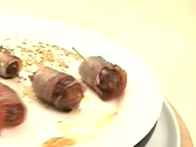 Необычный рецепт приготовления бекона.Состав: финики — 15 штук;бекон — 7 кусочков;мед.