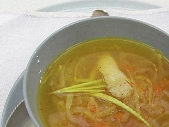 Суп из нежного морского языка.Состав:морской язык — 2 штуки;рыбный бульон — 400 гр;фенхель — 50 гр;лук порей — 1/2 стручка;томат — 1/2 штуки;цедра одного апельсина;морковь — 1/2 штуки;лук — 1/2 штуки;шафран, соль, белый перец, лавровый лист — по вкусу.