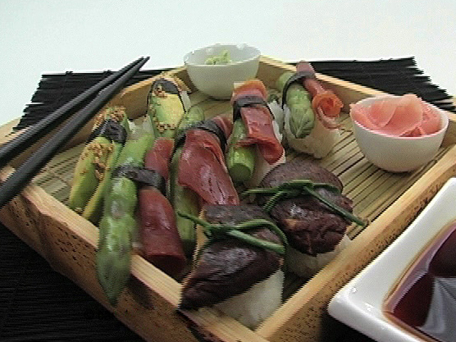 Вкусные и простые суши с ветчиной и овощами.Состав:ветчина — 3 дольки;спаржа — 4 стебля;шитаке — 1 гриб;полоски нори;авокадо — 1/4 штуки;рис — 80 гр;кунжут по вкусу.